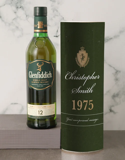 Delight someone special with this exceptional personalised Glenfiddich Whisky crest tube. Made with extraordinary care and attention, each Glenfiddich Single Malt is a work of perfection. Beautifully packaged in a crest tube which can be personalised with their name, year of birth and a personalised message, this is available in either Glenfiddich 12-year (750ml).